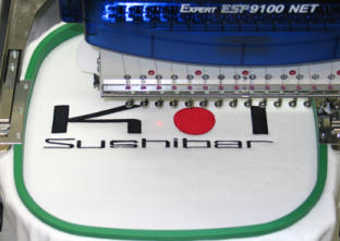 gerecht wird. Für die Serienfertigung wird das zu bestickende Textil in einen Rahmen gespannt, um die vorgegebene Stick- Position zu erzielen.
